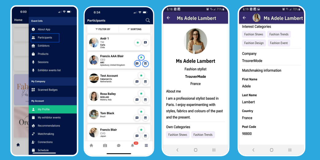 Users have a detailed view and can interact with visitors' profiles using the event mobile app. Users can send messages and meeting requests directly from the app and can mark any profile as a Favourited.